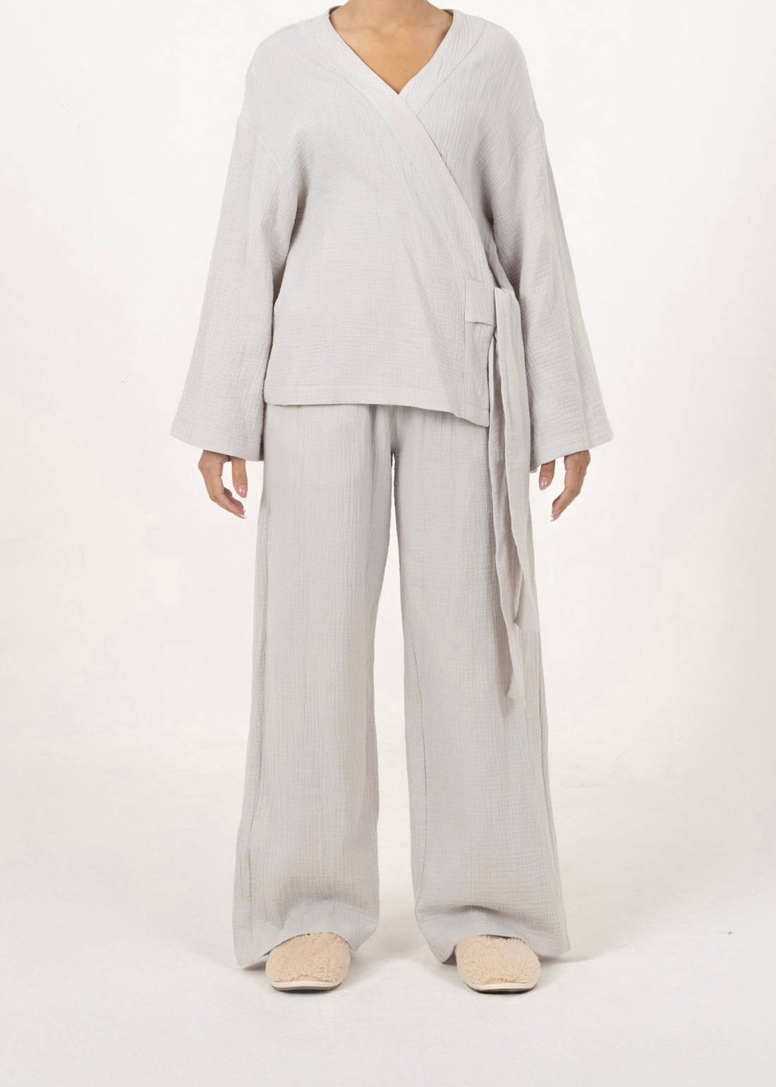 بجامة قطن عضوي ١٠٠٪ مكون من بنطال بقصة مستقيمة وجيوب جانبية القطعة العلوية تلف وتربط